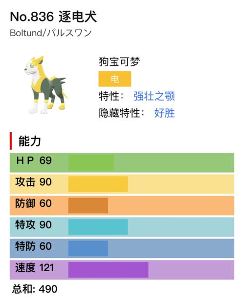 逐电犬的种族值为攻击90、防御60、特攻90、特防60和速度121,总和为490。从种族值来看,逐电犬的速度能力极佳,但三防偏低,双攻能力也不突出。在技能方面,逐电犬的特攻技能组相对较窄,而物理技能组则相对丰富。